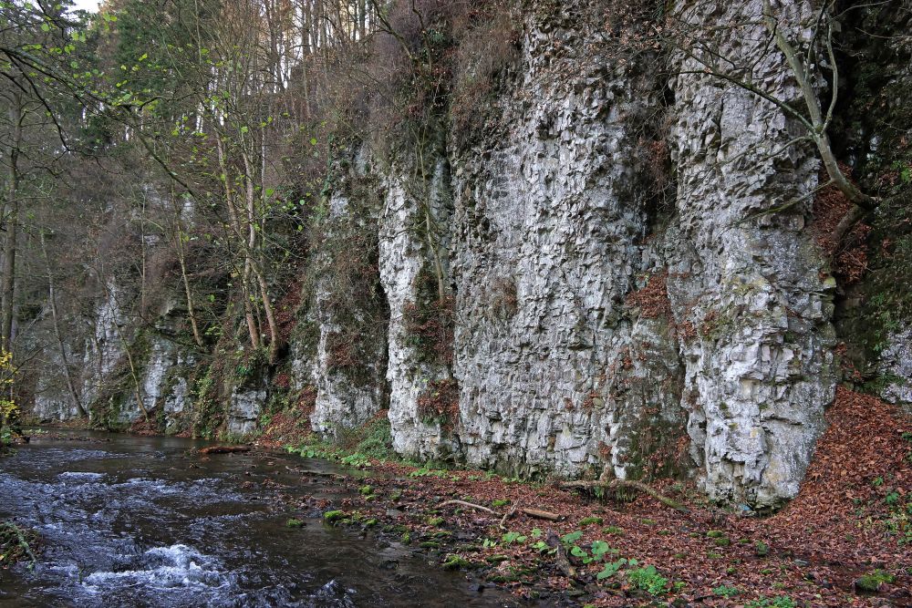 Celkový pohled na kolmou stěnu skalního defilé lokality Baba, svisle načleněné erozně i korozně rozšířenými puklinami. Skalní stěna přímo upadá do řečiště Metuje.