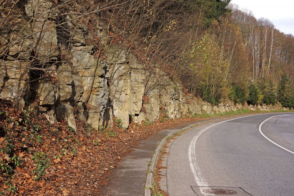 Celkový pohled na skalní odkryv při silnici pod svahem zalesněné Strážnice.