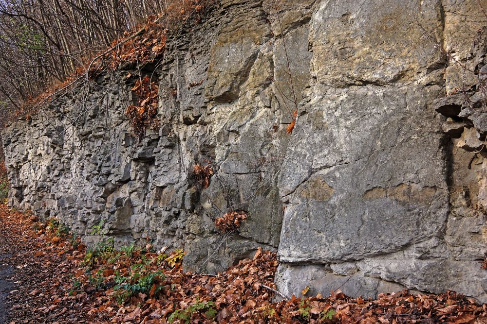 Čočka šedého písčitého vápence s projevy vzniku skalních sloupků vlivem selektivního chemického zvětrávání.