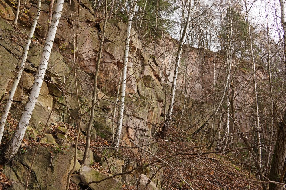 Celkový pohled do vysoké lomové stěny pevných narůžovělých permských ignimbritů s množstvím rozvolněných bloků téže horniny při jejím úpatí.