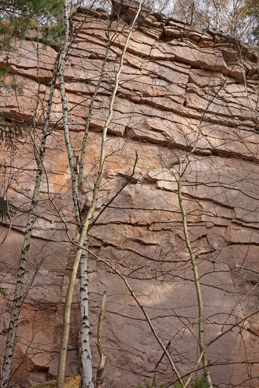 Detailní pohled do lomové stěny svědčí o značné petrografické jednotě horniny a také silné rozpukanosti jejího masívu, která stoupá na hustotě směrem k původnímu povrchu terénu.