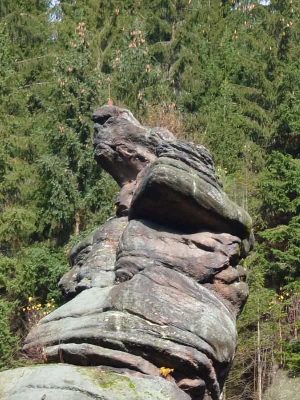 Různé směry rozvětralých vrstevních spár na skalní věži odráží charakteristické selektivní zvětrávání žaltmanských arkóz podle silně proměnlivého zvrstvení jednotlivých poloh sedimentů.