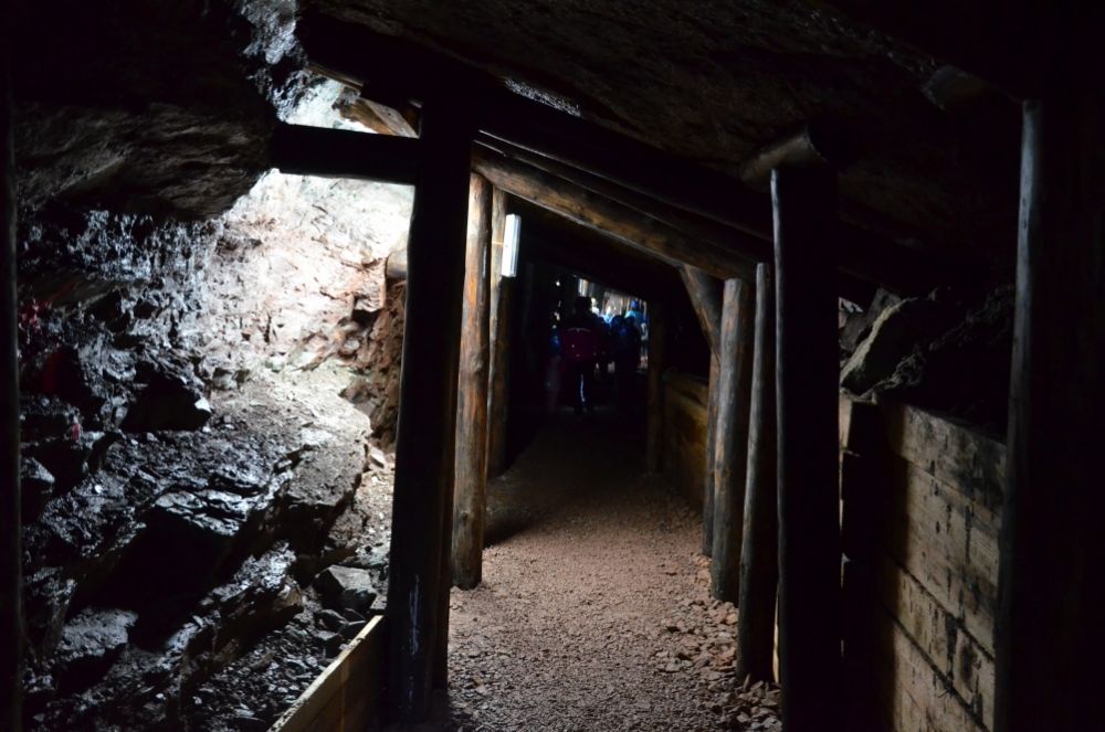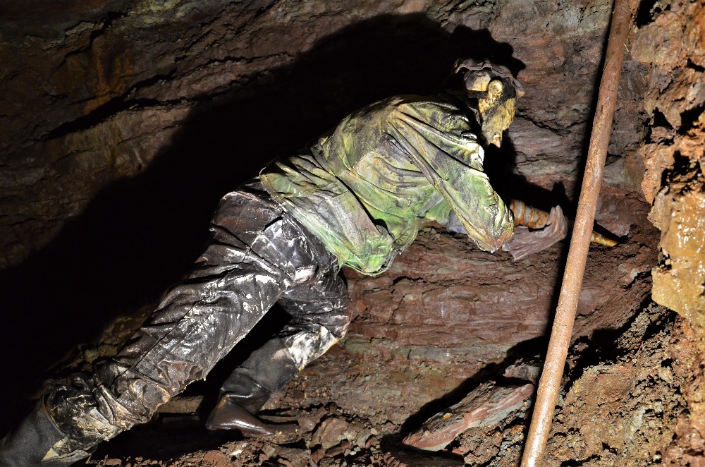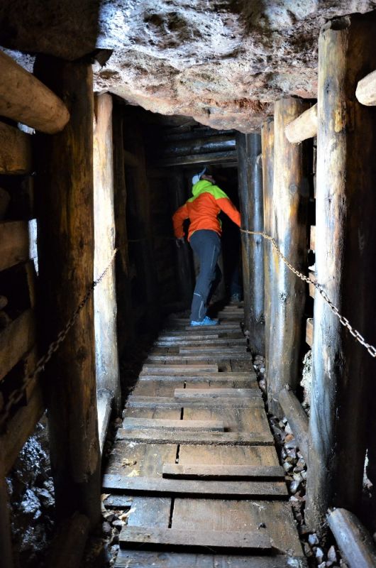 Prohlídka podzemí starého měděného dolu končí dovrchní (vzestupnou) chodbou a výstupem na povrch komínem po kolmých žebřících.