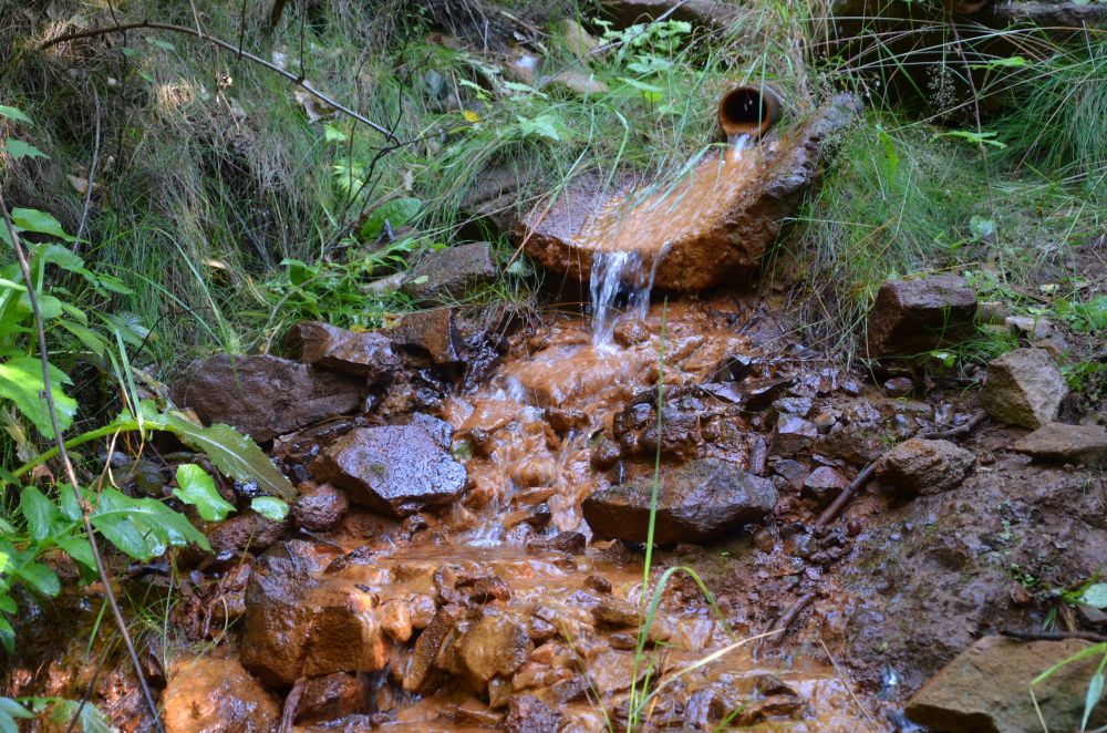 Z nedaleké zavalené dědičné štoly vyvěrá silně železitá důlní voda.