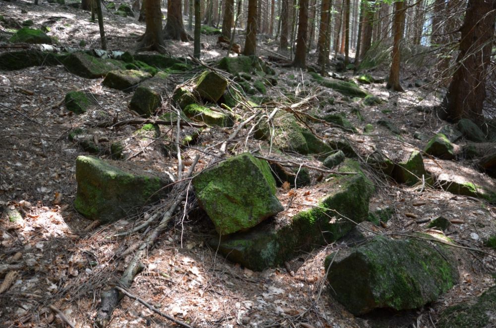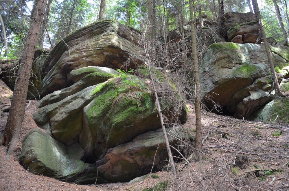 Z hřebene zřícené balvany zde nezřídka poskytují originální pevný a výživný podklad kořenům náletových stromů.