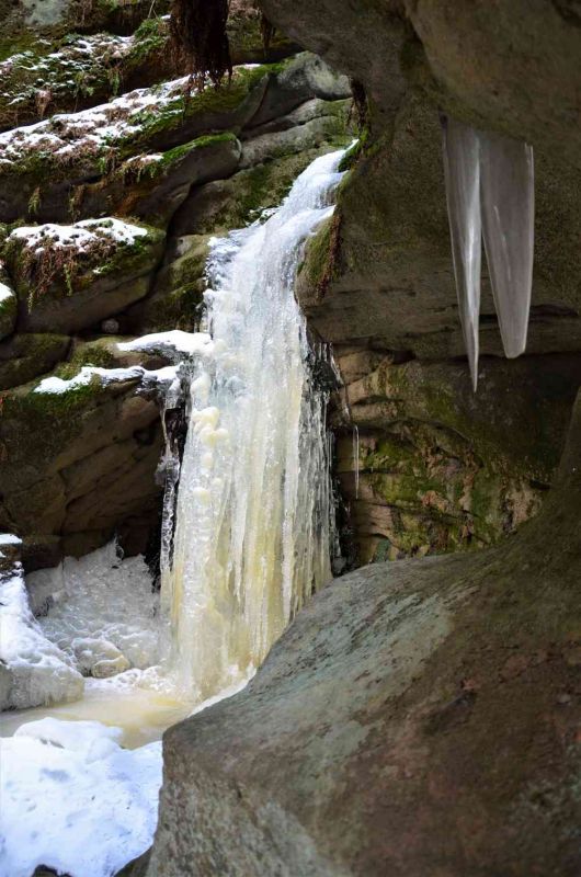 V mrazivém počasí se drobný vodopád mění v impozantní ledový stalagnát.