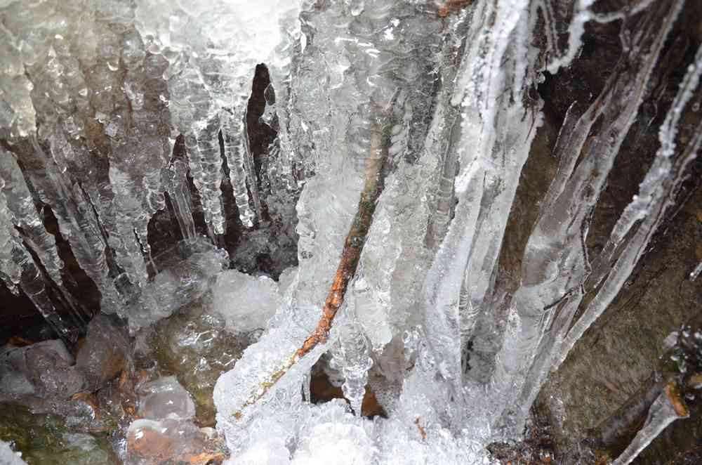 Voda mizející v hlubině kamenné suti pod vodopádem zalévá vše do křišťálového ledu.