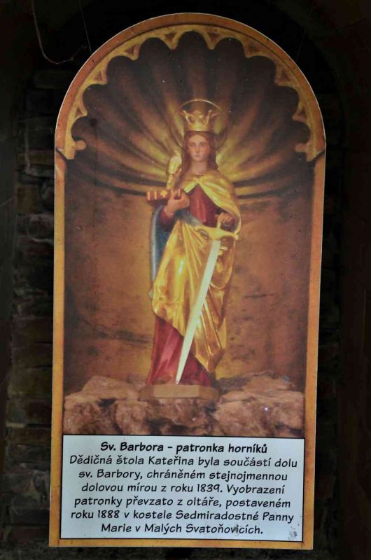 Na čelbě zrekonstruovaného ústí štoly je připevněno vyobrazení sv.Barbory - patronky horníků.
