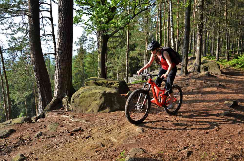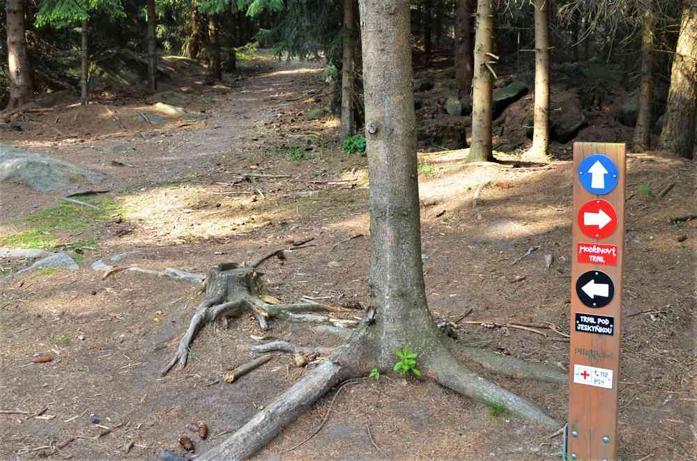 Jednosměrná terénní cyklostezka střední obtížnosti - Modřínový trail vede přímo po hraně jižních Čížkových kamenů s krásnými výhledy na Krkonoše.