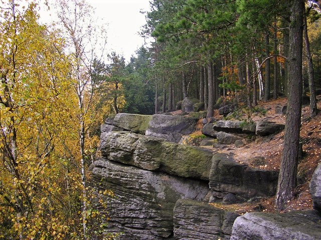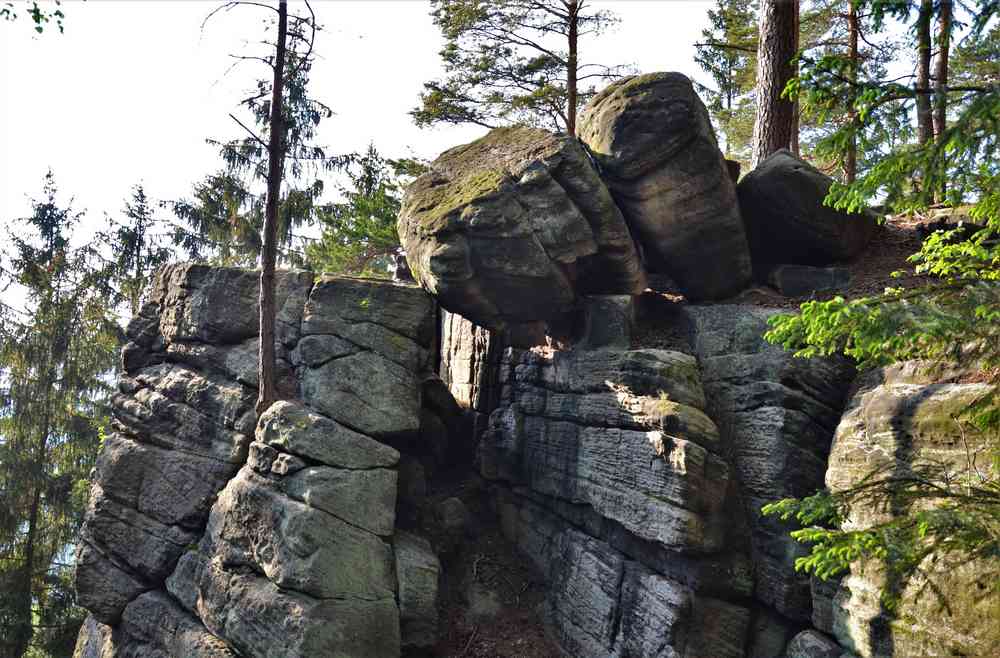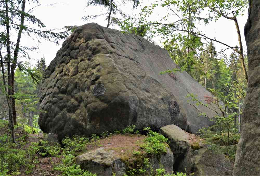 Na zříceném sloupovitém kvádru pevného šedého pískovce si můžete prohlédnout zajímavou formu škrapovité eroze jeho původně vrcholové plochy, vzniklé působením srážkové vody.