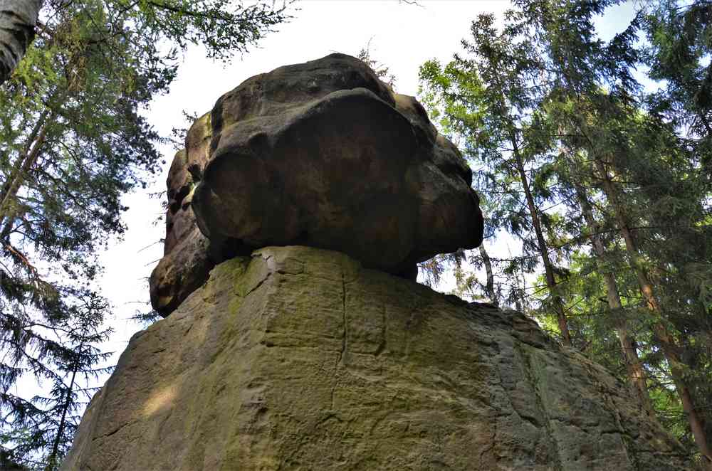 Nepříliš stabilně vyhlížející skalní klobouk, posazený na hraně kvádru světlého pevného pískovce a tvořený selektivně zvětralým železitým pískovcem, můžete najít hned vedle modré cyklotrasy Kozí trail.