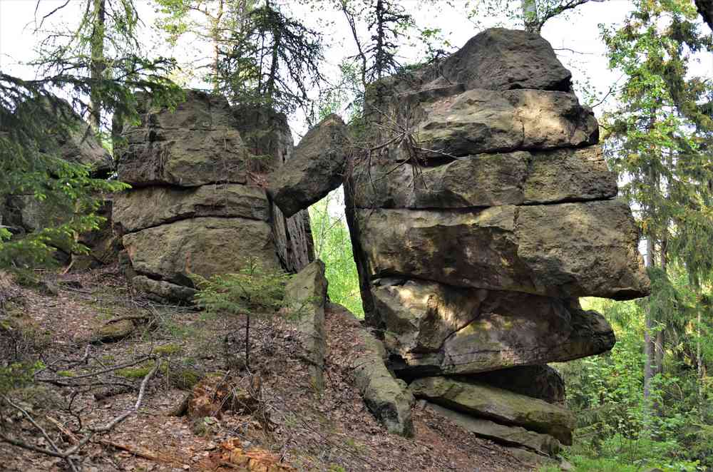 Skalní výchoz světlešedých křemenných kvádrových pískovců s reliktním balvanem selektivně zvětralého nadložního hrubozrnného železitého pískovce na severním vrcholu Čížkových kamenů.