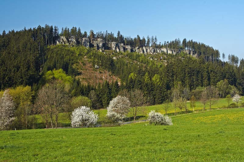 Pohled na Hejdu od východu (v popředí silnice Pěkov – Lachov) s členitým skalním srubem v okraji vrcholové pískovcové strukturní plošiny a úpatním svahem zvětralinového pláště tvořeného gravitačně sesutým materiálem.