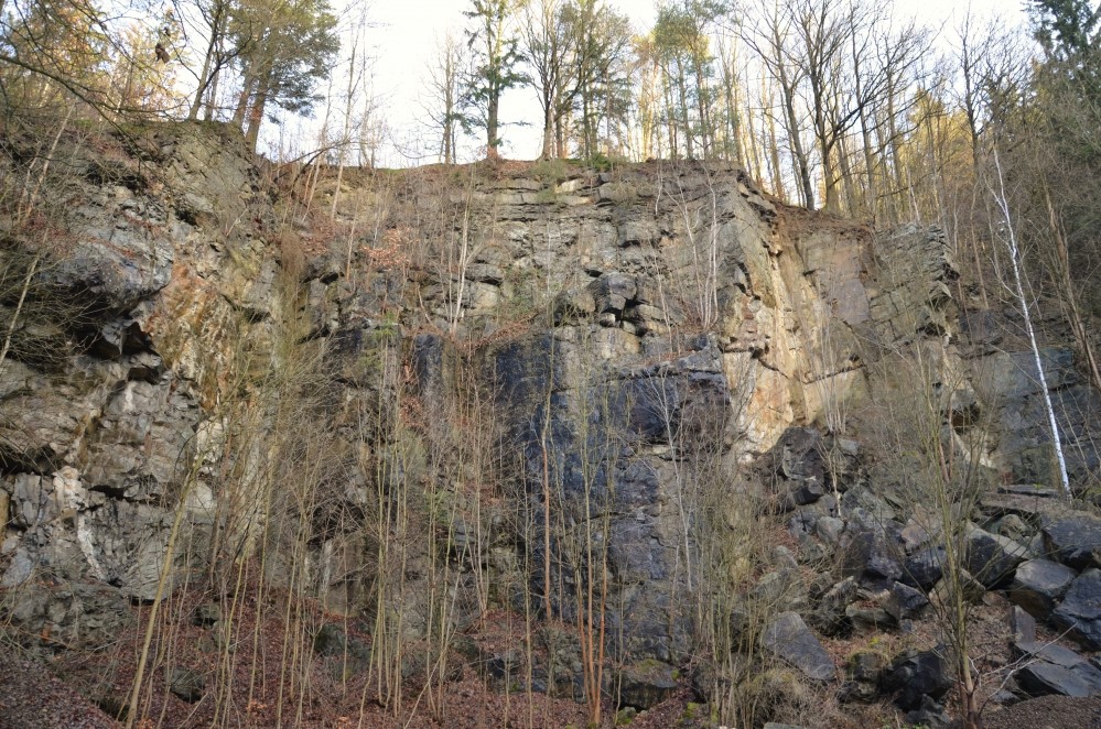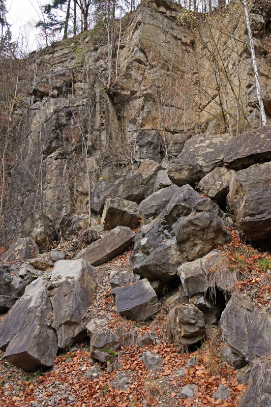 Celkový pohled na lom Kalabon s více než 20 metrů vysokou lomovou stěnou a velkým osypem rozvolněných bloků kdysi těžené křídové horniny.