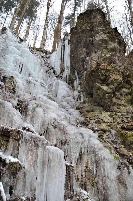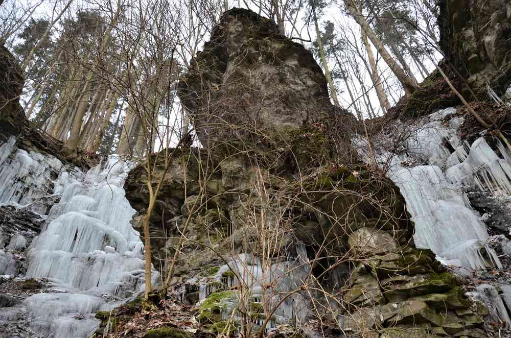 Ledové kaskády svým zimním kouzlem romanticky doplňují vzhled slínovcových skalních věží a pilířů.